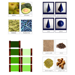 | fruit 3 part cards; geometric solids 3 part cards; colour tablets boxes 1, 2 and 3; herbs and spices 3 part cards |